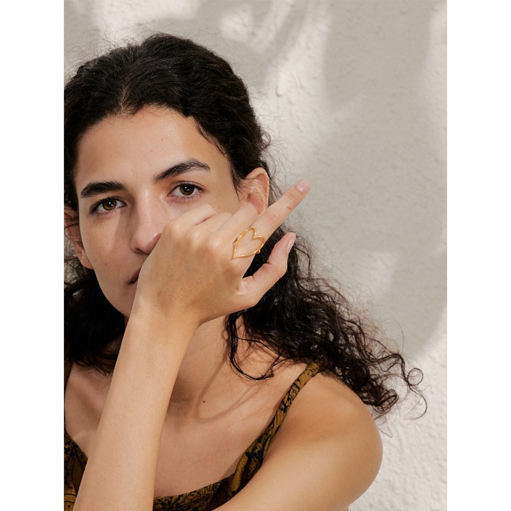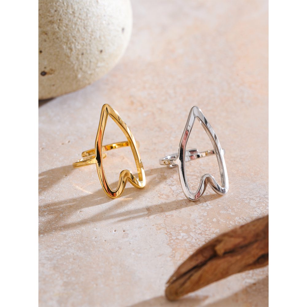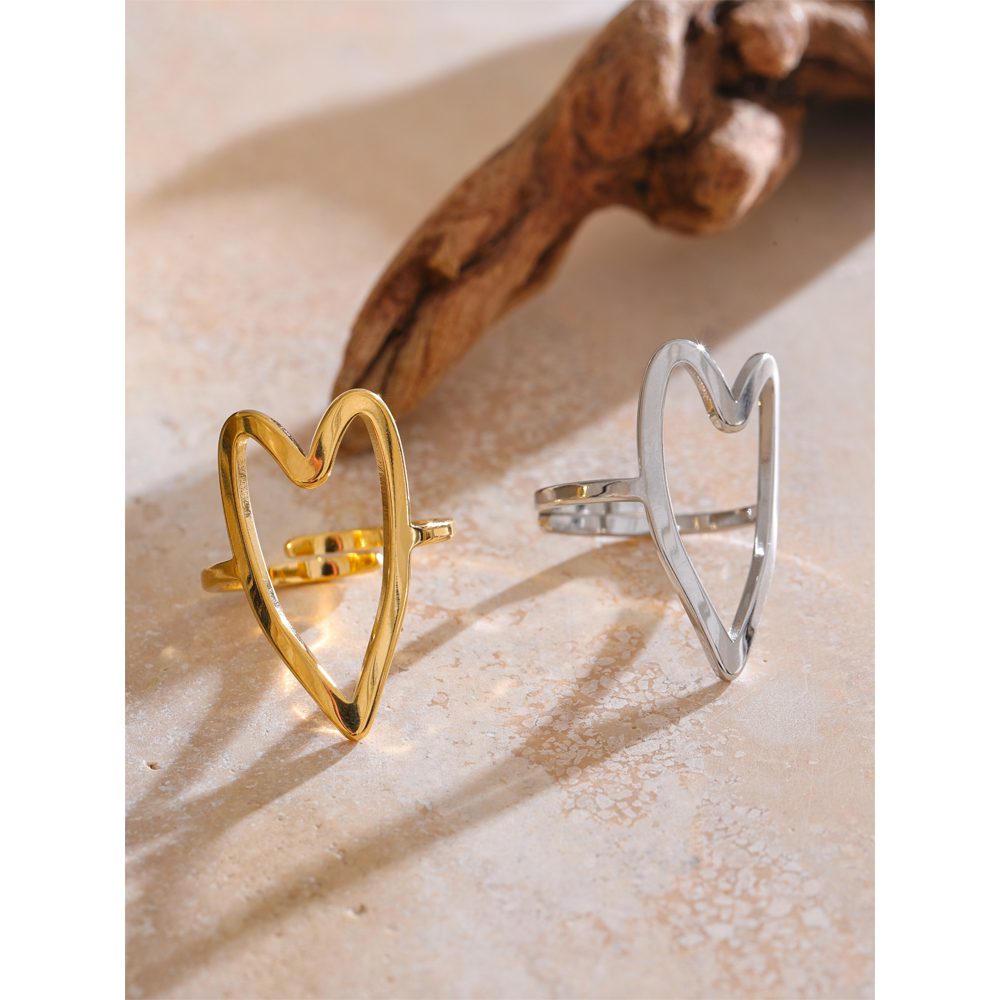 This is a modern, gold-tone ring with a large, hollow heart shape at the top. The design is minimalist and the ring is adjustable to fit various finger sizes.